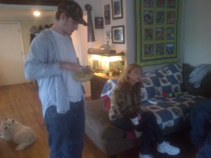 that my music (late 90’s alternative rock) is not “family friendly,” and having me change Pandora, he wandered into the living room with his bowl of egg yolks to discuss Tony Rice with our Aunt Connie while he mashed and mixed yolks with mustard and mayonnaise.
