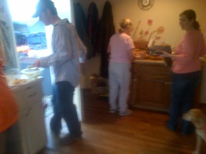You can see my dad and Preston standing there by the punch bowl. This is the best punch on the planet, hands down. It beats to heck that scary green stuff you get in the jug. Grandma’s been making this punch as long as I can remember. It’s the first thing she did when she arrived last Thursday. After making punch, she had to advise Preston in the art of making devilled eggs. He’s a huge fan, and thinks no holiday meal can be complete without them. Since I hate eggs in any form, and had plenty enough to do already this year, his only options this year were to make them himself or go without. He opted to make the eggs.
