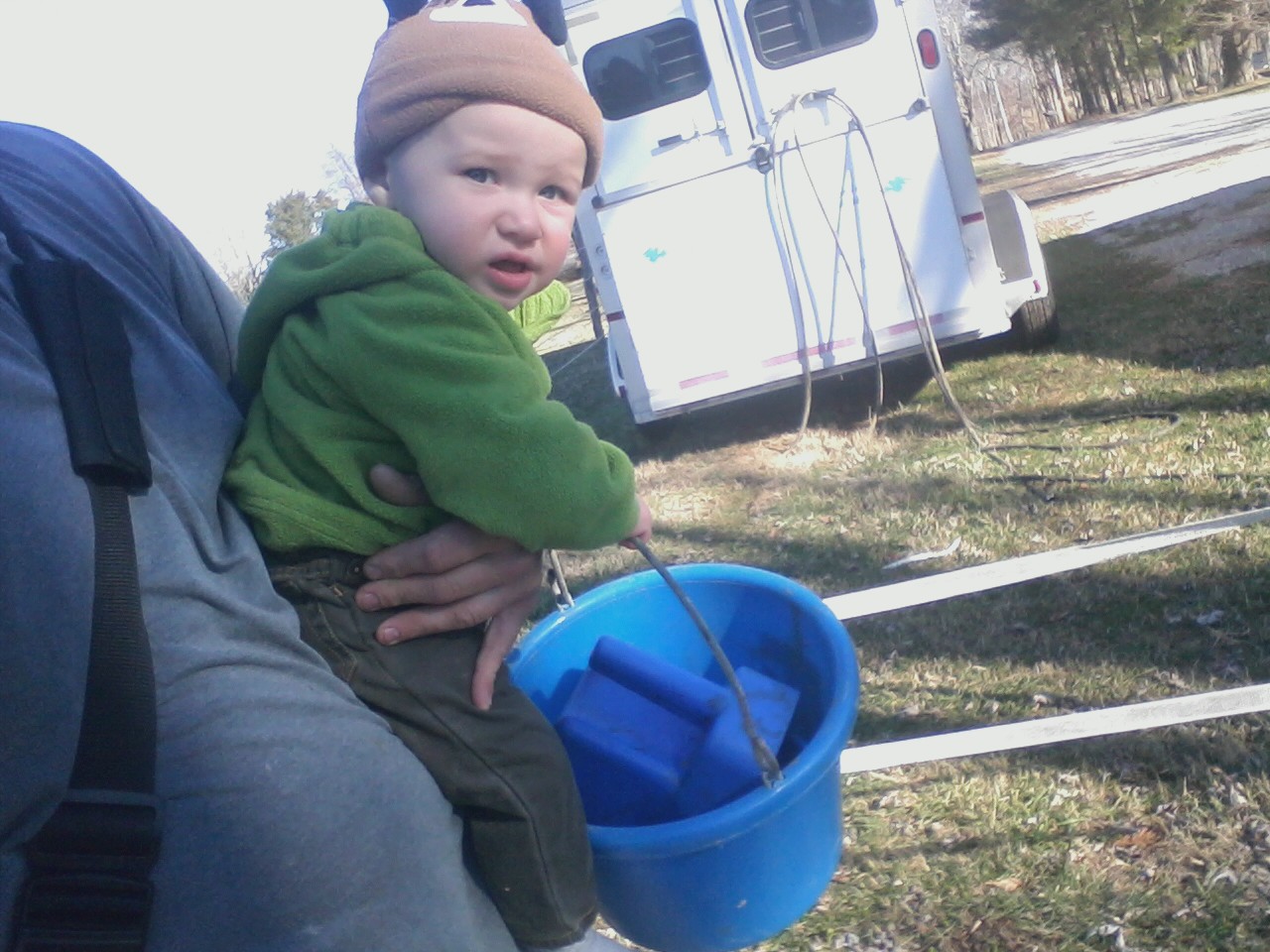 outside and feed quickly by myself, but Ian loves going outside, and he enjoys being around the critters. He giggles when the chickens cluck and crow at him, and he pulls on Dominick’s ears and Bear’s mane. While Ian doesn’t complicate matters too much, carrying grain and a wiggly little boy can be a little difficult. Now, however, once we mix grain and supplements in the bucket Ian grabs the handle and carries it for us. Just holding a little boy is simpler than juggling him and the bucket. By the time Ian starts walking, I should have a fully trained barn manager on my hands.