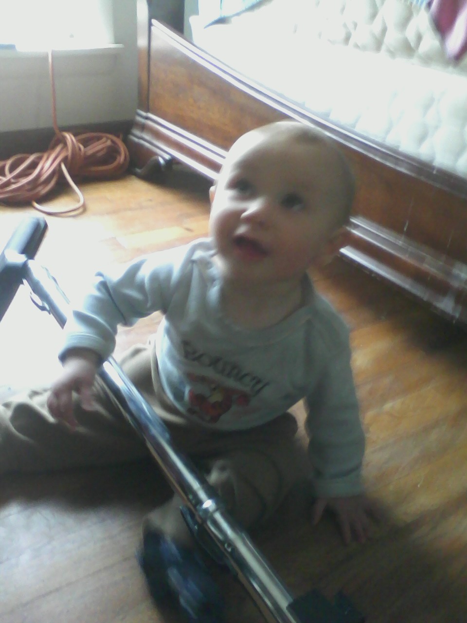 On top of Ian’s newfound mobility, he has taken an interest in helping Brinn and I complete all of our chores. We’ve found that it’s impossible to convince Ian to eat if one of us is vacuuming. The distraction of the roaring appliance prevents him from concentrating on the spoon or the food. He whips his head around and stares, openmouthed, the entire time the vacuum runs. If we put him in the floor while we vacuum, he chases the appliance around the floor. Yesterday Brinn handed the end of the vacuum to him, and he had a big time trying to push it around the floor.