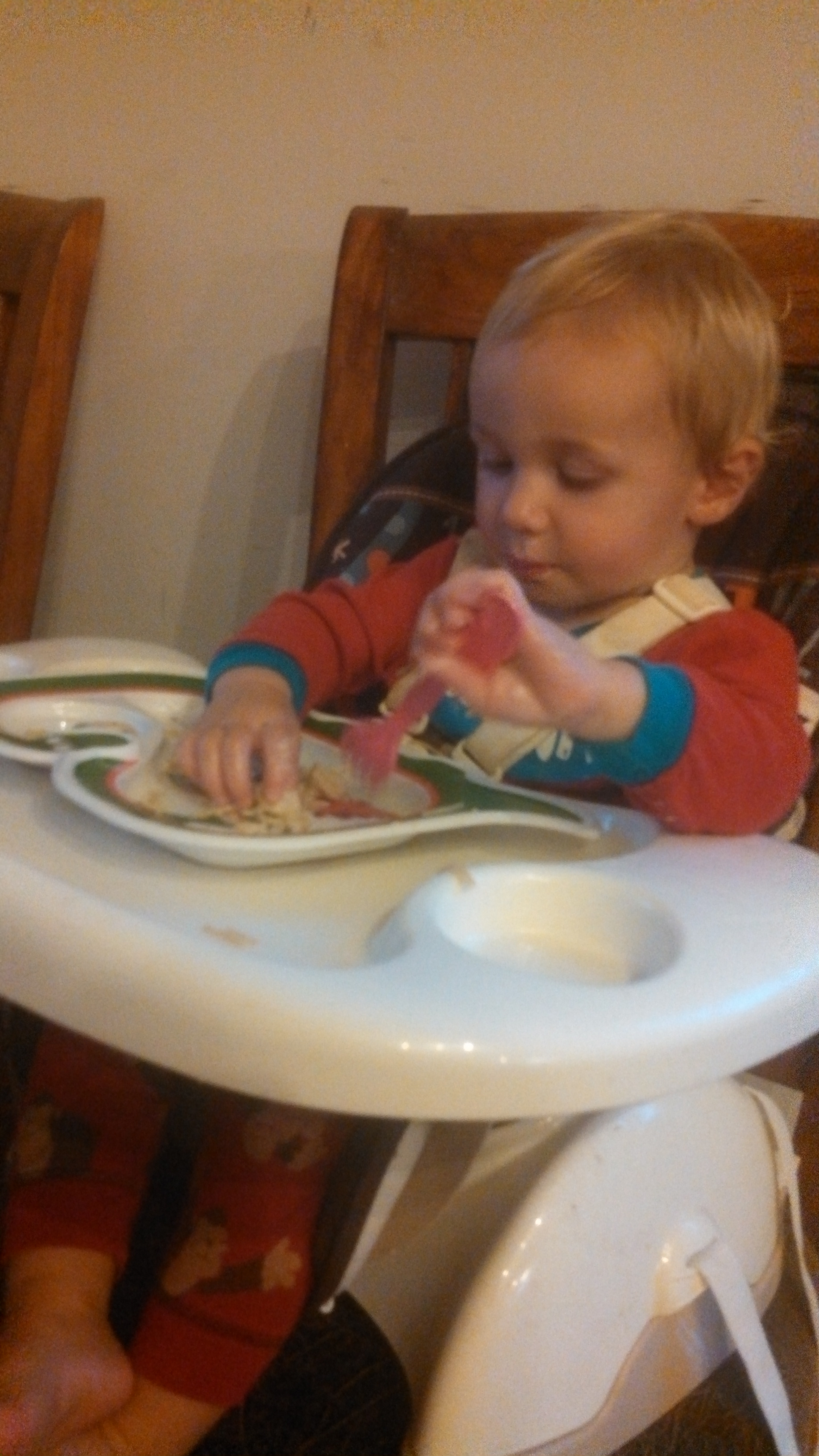 Did I mention that through all of this I was missing a lovely dinner with Virginia and Dr. Laird? No soup, salad, and bread sticks for me that evening. After this incredibly stressful evening, we returned home to get Ian a cup of milk and a tube of yogurt. Within minutes of eating, he was running around and playing with Mogwai and Chaco while I threw together a quick dinner for Brinn and I. Once our chicken alfredo (my last attempt at salvaging my Olive Garden evening) was ready, we sat down to eat and put a little on Ian’s plate, not expecting him to eat very much. Guess who had 3 servings (and then licked his plate clean)!