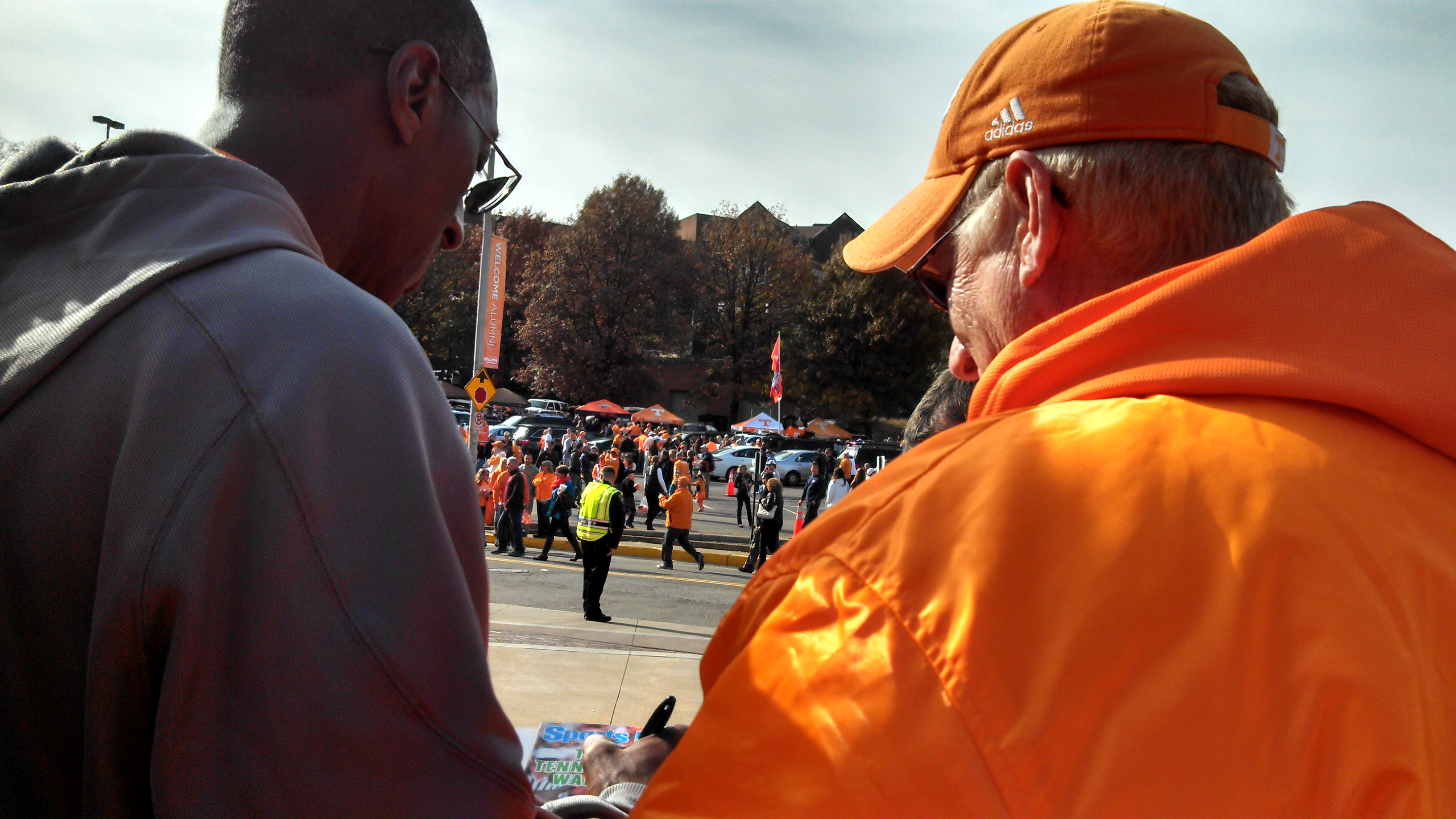 In preparation of Tony’s attendance of the game, my dad acquired the October, 1985 edition of Sports Illustrated featuring Tony on the cover. Shortly after the vol walk ended last Saturday, we hauled ourselves quickly over to the Call-In Kickoff Show where Tony was scheduled to participate. When I was a kid, I can remember attending the kick off show to see voice of the vols John Ward, and at one point in the show, kids could line up for autographs. We attended the show with this mindset in hopes that Daddy could have Tony sign his magazine. 15 minutes into the show, however, there was still no sign of Tony. A bit disappointed, we left the show to begin our trek to our gate, and just so happened to make our exit by going behind the stage rather than in front of. As soon as we got behind the stage, we saw a tall, skinny scarecrow of a man garbed in UT smokey grey