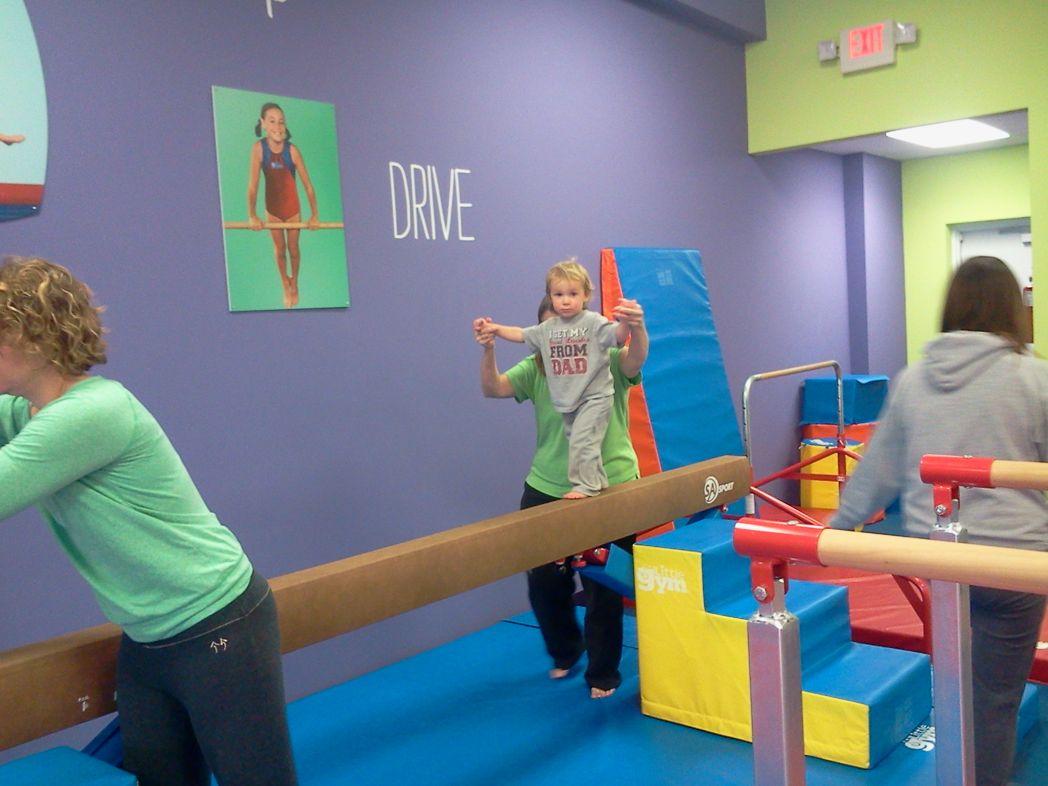 Ian’s not performing roundoffs into back hand springs, or jumping into squat throughs on the vault, but he is learning important skills that are already helping his development. Ian’s a reluctant talker so far, but when he’s at a lesson, he screams “BALL!” when he notices the teacher move towards the closet where balls are stored. Physically, he’s developed more coordination as h