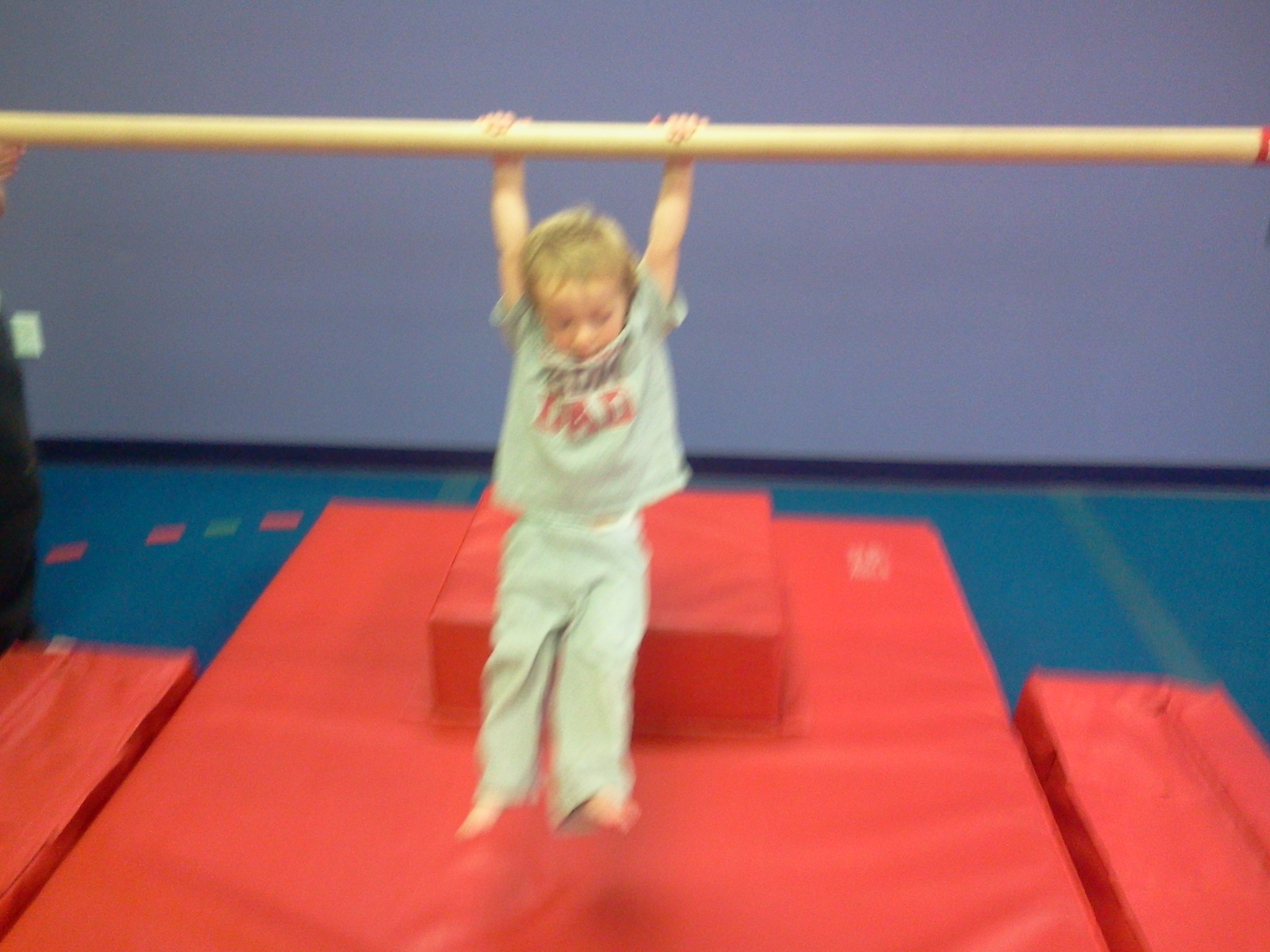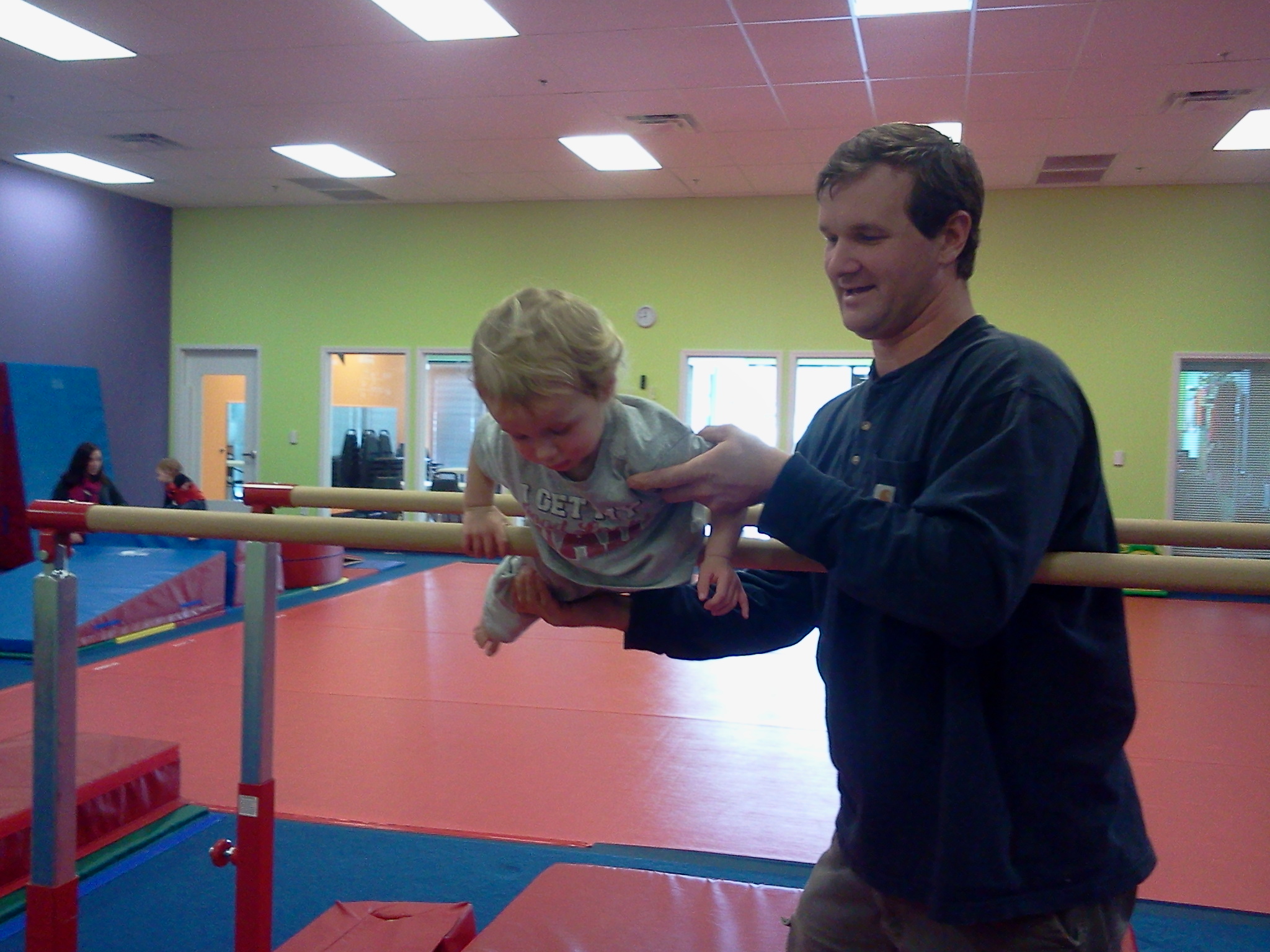 Another area of improvement we’ve noticed is with socialization. Ian’s finally entered the age of “stranger danger.” He doesn’t like for either of his parents to leave him behind, and he refuses to let a new person pick him up. In his first lesson, he was very reluctant to go to the instructor, or the managers of the gym. By the end of the lesson, he was running up to his teacher, and begging the manager for extra handstamps. And on top of all that, it’s just flat-out fun to see his face light up and hear him chatter and squeal in delight as he learns a new skill or masters a new feat.