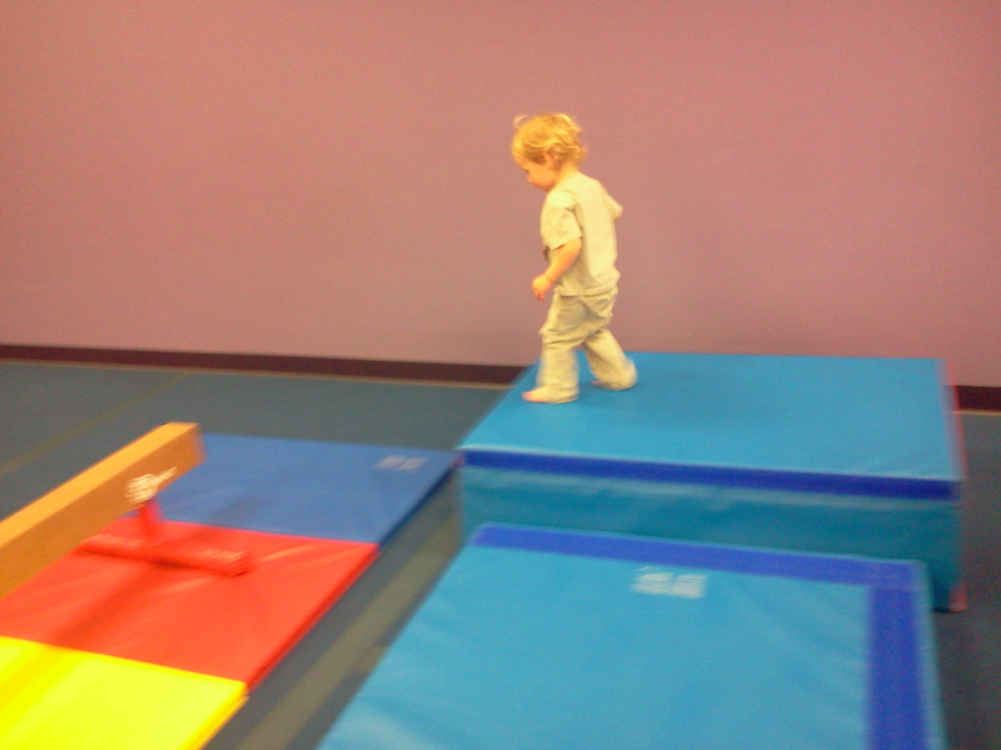 class with a fun warmup complete with music. From there, the children can play on the equipment (with parental assistance) for a short while, then students join the teacher for the “lesson.” Sometimes this involves doing forward rolls, walking the balance beam, crawling through a tunnel, etc. Then they proceed on to ball time. The