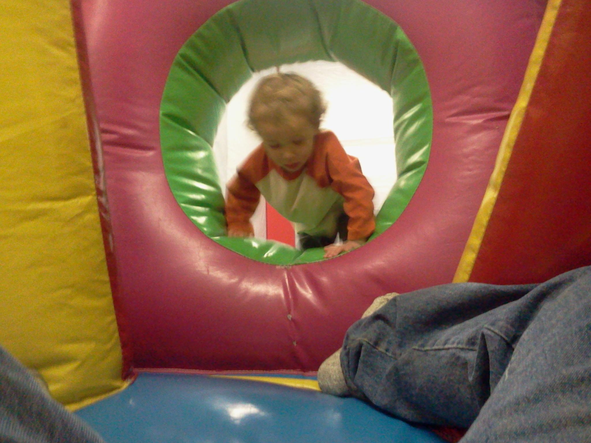 fascinated with a project he largely jumps from task to task or toy to toy like a squirrel on caffeine. So it didn’t take him long to start exploring everything else the factory had to offer, including large cushioned jungle gym type structures for him to climb through and over. Ian also discovered the ball pit early in his adventure.