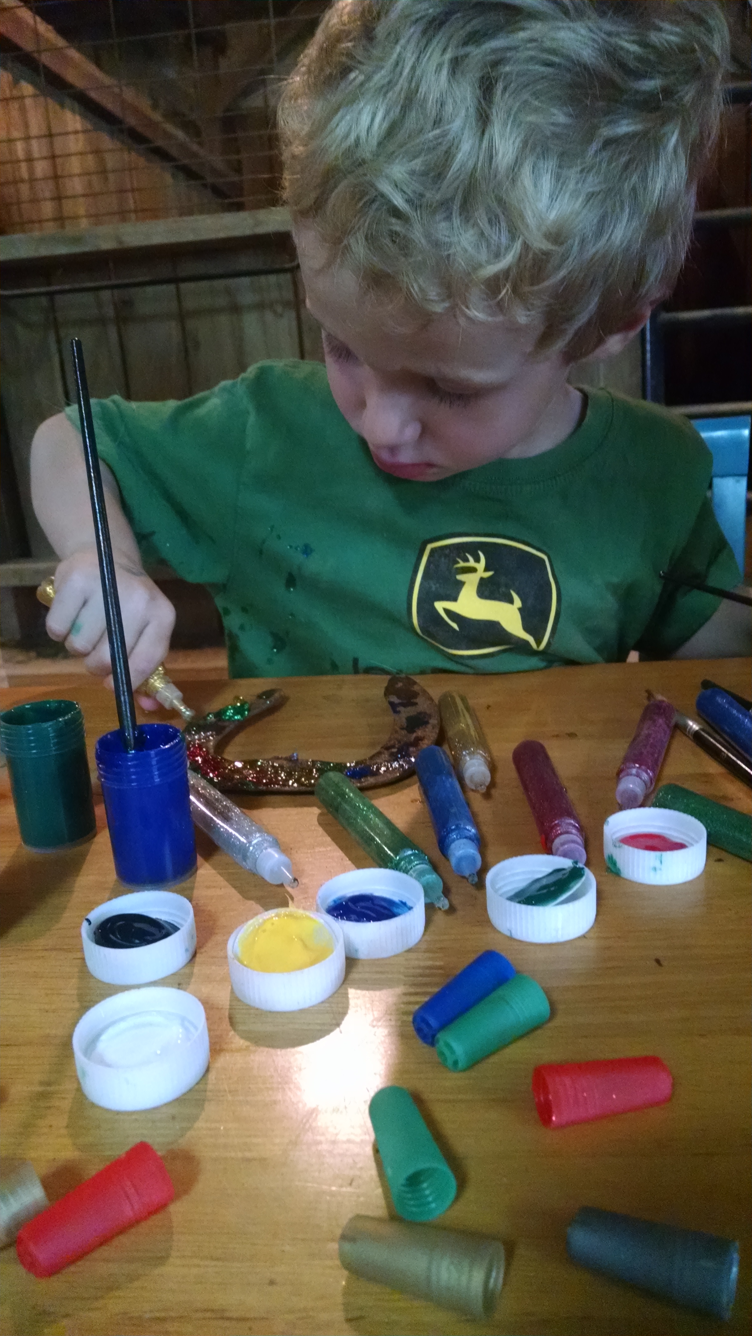 ponies with live-stock crayons. They painted horse shoes, played with Ian’s new bubble machine, ate cake and ice cream, watched Ian unwrap presents, and then used some of those
