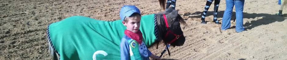ainbow of colors in horse coolers for the full-sized members of my herd. I’ll bet she could make a pony sized cooler. But will Ian really want an orange cooler once Halloween is over? It took some subtle idea dropping, but eventually Ian decided that he could wear his train costume from last Halloween and dress as Percy the train with Badger. Now he could have a green color, which he’ll be excited to use on Badger for every cold weather walk we take this winter. Grandma quickly assembled the cutest tiny cooler I’ve every seen, and even stitched “6” on each side, since Percy is the 6th engine on the island of Sodor.