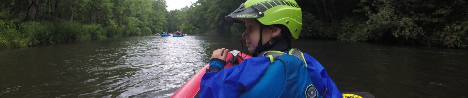 of layers he’s wearing. During our 2016 Nantahala trips, Ian tended to spend most of each trip sitting on a thwart in the middle of the raft. He enjoyed the trip, but he did not particularly care for the mind numbing cold of the splashes. This year, we’ve added fleece underneath Ian’s wetsuit layer, and spray gear on top of that. Now he’s gone from sitting near the middle of the raft, to leaning over the bow of the funyak to take the waves head on. Huge difference!