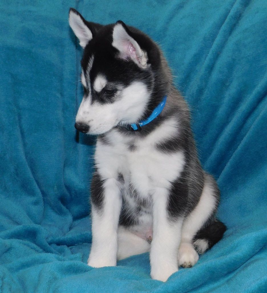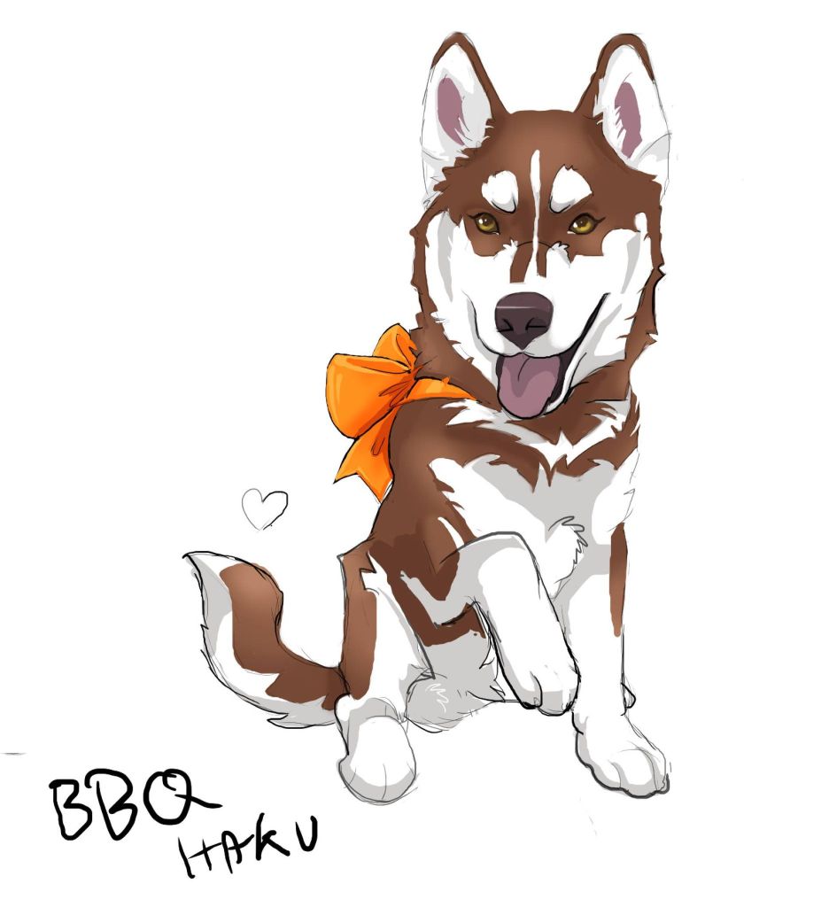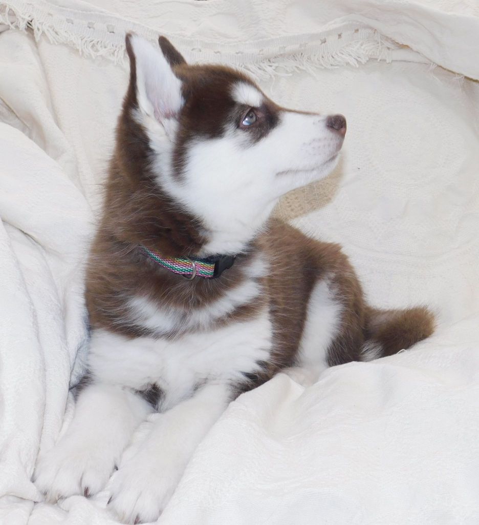 BBQ Haku, the only female pup from this litter, wears an attractive, but not overly feminine orange bow. She’s provides a strong model for other girls as she’s employed in technical communications for the racing team.
