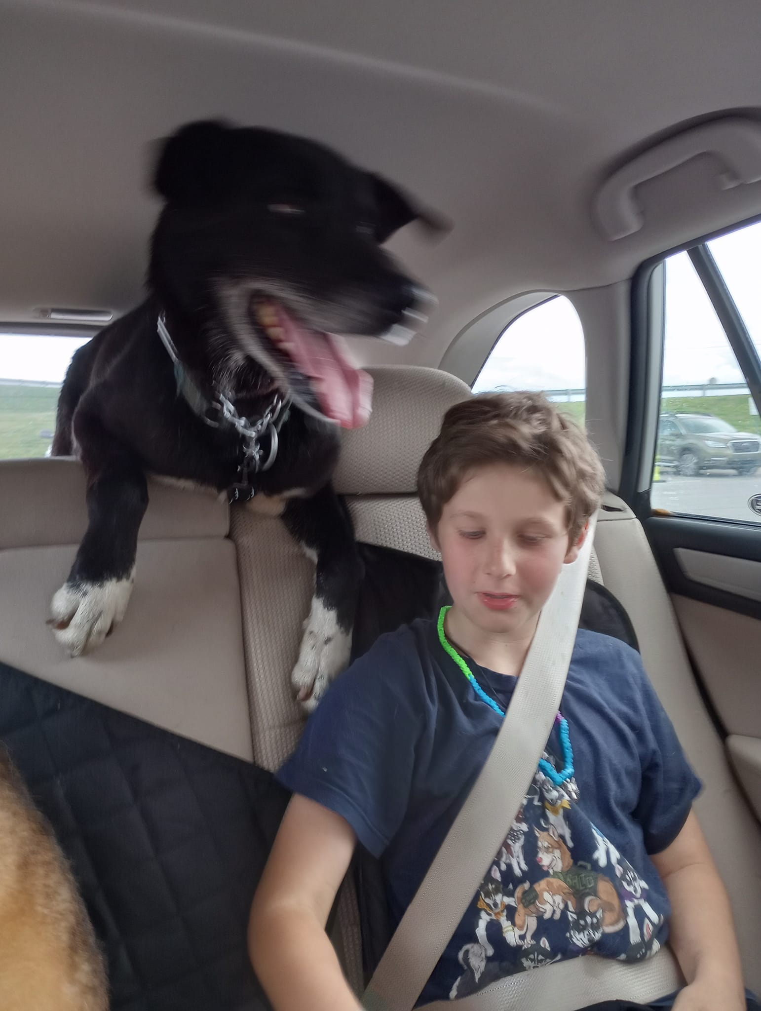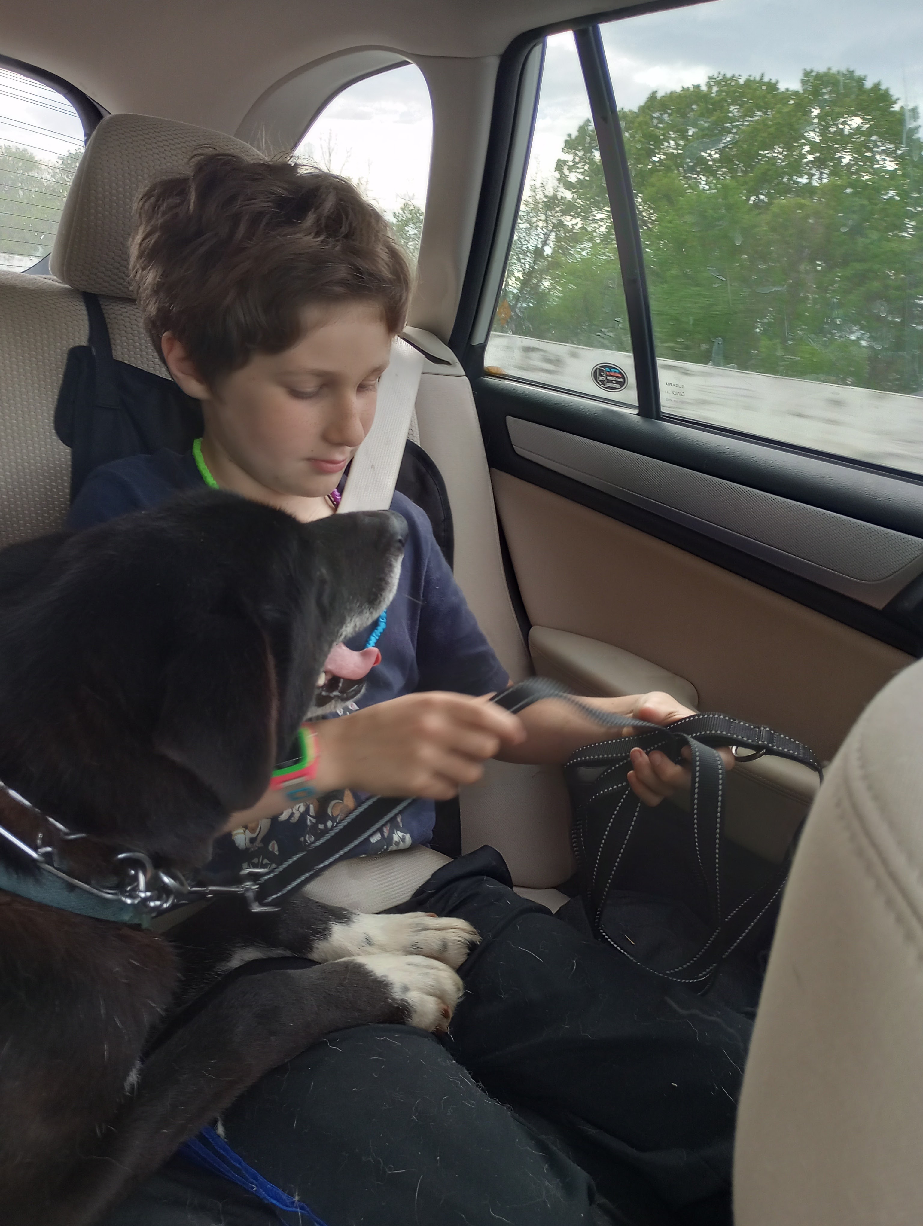 And we made it almost a quarter of a mile before Pilgrim rearranged the seating assignment. We pulled over for a quick game of musical chairs and Pilgrim instructed Falcon to move it to the back. Falcon instantly agreed, and Pilgrim crawled in Ian’s lap for an hour of snuggles. With the new configuration, we managed the rest of the drive without incident and Pilgrim told Ian all about his plans for becoming a southern husky.