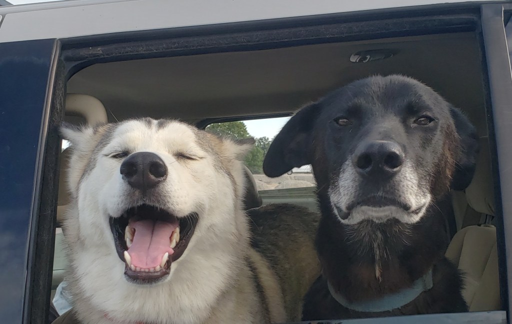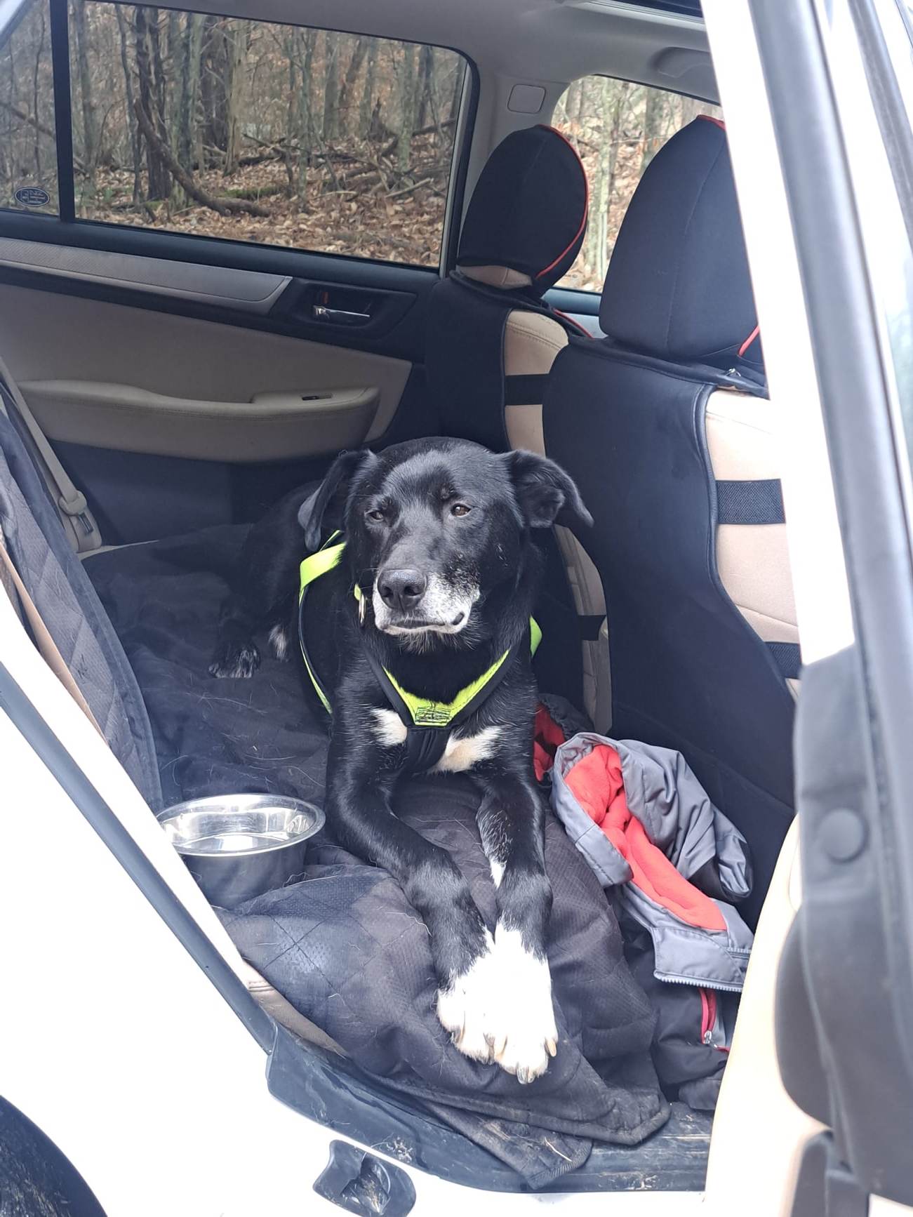 After 9 months of considering, investigating, researching, hunting, and scheduling, Ian’s sled dogs were finally here. Pilgrim strolled out of his crate as if he owned the building, and announced that he has changed his name to Pilgrim Kiser and he’s ready to go home with Ian. Falcon definitely had more reservations about us, but he was still extremely mannerly for a working dog who just spent 12+ hours in a crate. We brought the boys to the car where we had water bowls ready and both got a good long drink, then each of them gave big stretches before moving over to the grassy area to take long pee breaks. While they went for round two of water, we disassembled the crates for the drive home, then got the boys situated in the car. Since Falcon seemed to be the less bold dog, we put him in the back seat with Ian, and let Pilgrim have the rear cargo area so he could stretch out. We exchanged final hugs with the Fosters, and started the last leg of the journey for Falcon and Pilgrim to reach their new home.
