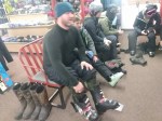 We could see the dogs as soon as we turned off the highway and swung into the kennel yard. Ian clearly itched to get out and cuddle with them, but we were immediately ushered into the main office by Frank Teasley himself. He had a very serious conversation with all the guests and shared his expectations for our behavior and participation on our trip today. Even the children were expected to pay attention and understand the seriousness of the rules, not only for our safety, but for the dogs, our guides, and other trail users. Mr. Teasley had us remove our footwear and handed out gigantic, heavy, and delightfully warm black boots to each of us. We laced up, and then were shown outside for our guides to come and meet us.