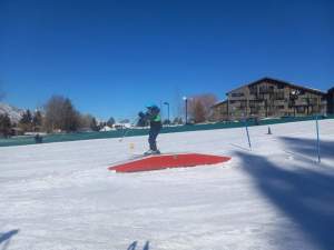 After perfecting his moves on the practice hill, Ian decided he was ready to show off and he called me to ask that I come and watch him. I pulled my boots back and drove the short distance to find Ian working on his jumping skills. Snow King had set out some cones, boxed ramps, and a small quarter pipe. Someone had also taken the time to pack snow to form little jumps. This worked really well for the boys as it gave Brinn the chance to coast backwards while taking pictures and videos of Ian having a big time.