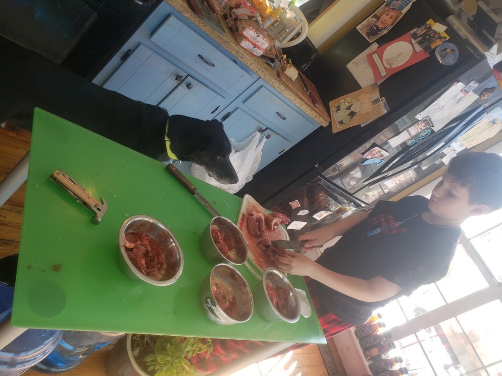 It didn’t take Pilgrim long at all to acquire half a dozen nicknames. Piglet, Piglet Pop, Boom Boom Feet, Smiley, Dobby the house elf and even “Hey You.” It didn’t matter which name we called, Pilgrim was always the first dog to respond. “Jenna, come now–” boom, Pilgrim magically appeared and said that we can call him Jenna. Pilgrim learned that Brinn’s taxidermy shop held all the best snacks, and he started hanging with Brinn during the work day and volunteered his services as clean up crew.