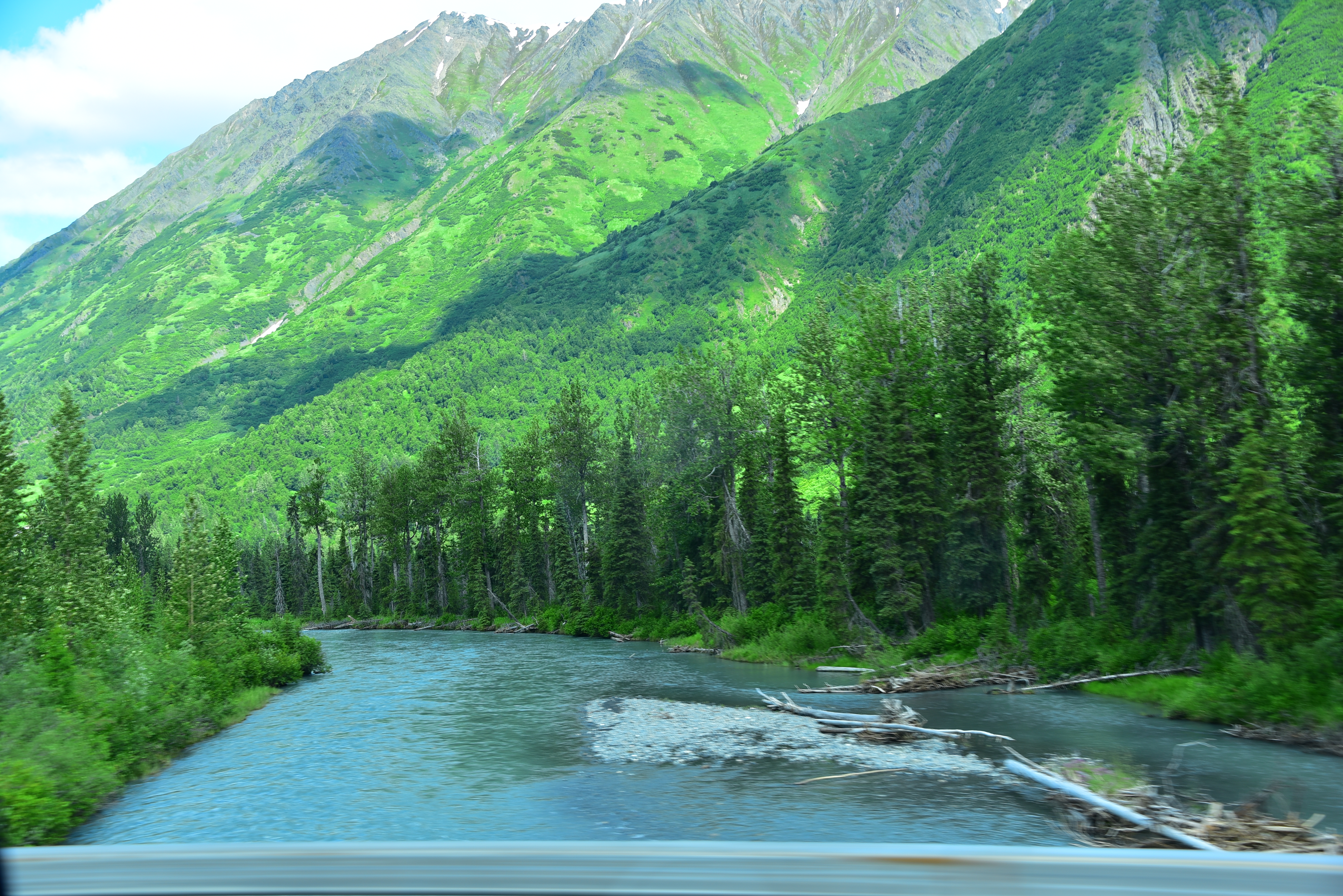 Of course we had to stop at Summit Hill Lodge once we made it that far since we learned that it’s our favorite cafe in the country. Another fun stop on the way back was off of the Seward Highway at Canyon Creek. This tributary runs into the infamous Six Mile Creek, which we didn’t have the opportunity to raft. Nonetheless, it was still a fun hike around CC, and there were bathrooms! You can tell we’re getting further north at this point because the beautiful blue water starts to regain the silty, gray glacier runoff. Goodbye beautiful Kenai blue!